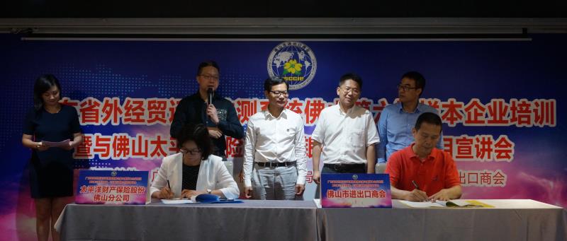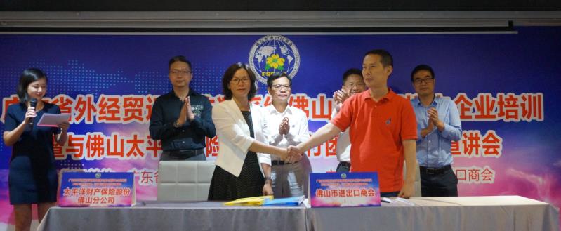 在佛山市商務(wù)局副局長童全慶、佛山太平洋保險有限公司總經(jīng)理何中元、佛山市進(jìn)出口商會會長和佛山紡出公司董事長嚴(yán)國山等見證下,佛山市進(jìn)出口商會副會長吳小勇代表商會,在8月30日與太平洋保險公司簽署戰(zhàn)略合作協(xié)議,為應(yīng)對中美貿(mào)易戰(zhàn)作好充分準(zhǔn)備。