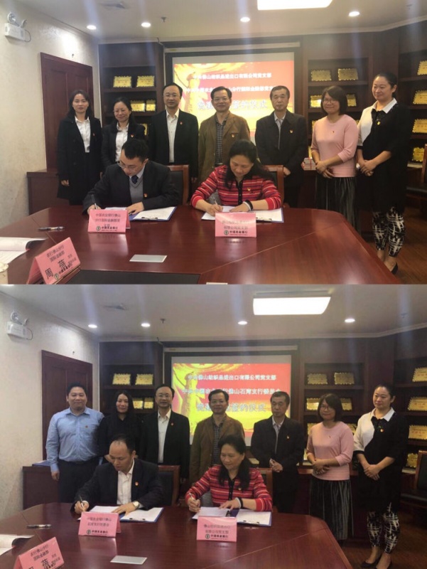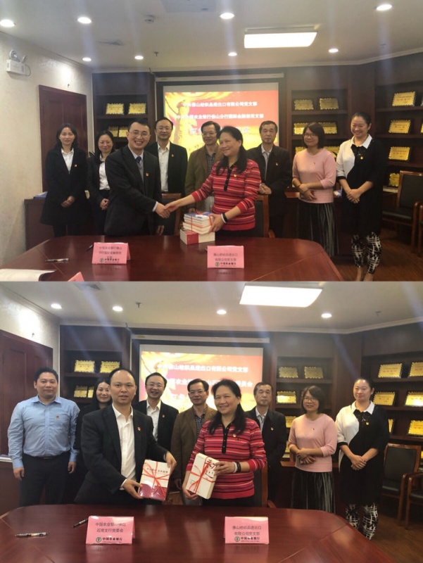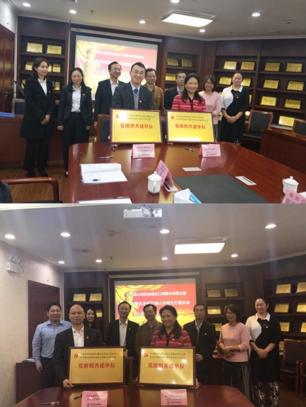 佛山紡織品進出口有限公司與農(nóng)行佛山分行國際金融部、石灣支行簽訂并交換了《黨組織共聯(lián)共建協(xié)議書》,相互授予了共建牌匾,并進行了贈書儀式。